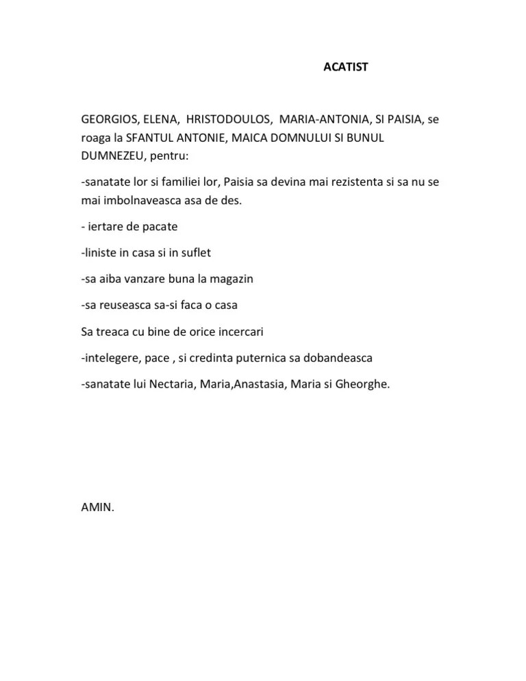 5 octombrie 2015 arhimandritul petroniu marin rugăciune , acatist foto: In numele tatalui si al fiului si al sfantului duh. 04.09.2017 · mijlociţi pe lângă împăratul ceresc pace, linişte şi bună rânduială pentru toţi binecredincioşii creştini. Dumnezeule, ascultă rugăciunea mea, pleacă urechea ta la graiurile gurii mele. 05.10.2015 · ce acatist să citesc pentru liniștea sufletului meu, dar și a celor adormiți? Aşa, sfinţilor făcători de minuni, nu treceţi cu vederea rugăciunile noastre, ci mijlociţi …